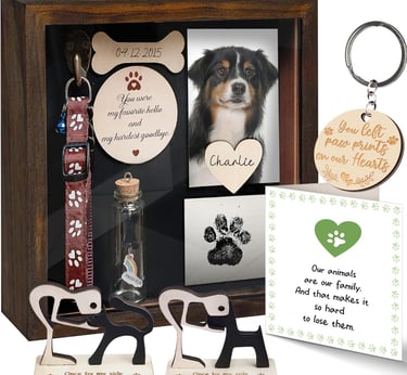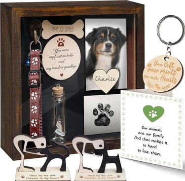 1) Pet Memorial Shadow Box: This shadow box is a heartfelt keepsake to preserve the memories of a furry friend. This Shadow box comes with a holder to hang the pet's collar, a paw-print kit, which often times the vet's office will make a paw print keepsake, but it too can be added to the shadow box. The shadow box also comes with a jar to keep a clipping of the fur, and a special sculpture with the choice of a cat or dog. Also included is an ornament that says, "You were my favorite hello," 2 tags for adding the pet's name and a pen to write the names. There is a place to include a special photo of the pet. The box 8.6"x8"6x2" wood with a clear acrylic cover. I love this idea. What a special way to remember a beloved pet.