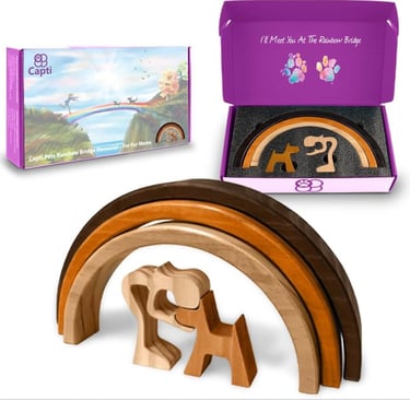 2) Handcrafted Wood Rainbow Bridge: Unique, Handcrafted, 100% Wood - No two loss of Dog Sympathy gifts are alike: Bold, Beautiful & Sturdy, these 3-tone stained wooden rainbow bridge pet memorial gifts boasts a unique variation in color, cut and size, sparking joy in the hearts of grieving pet owners as they perfectly perch atop the mantle, shelf, nightstand or table. Gifts from this particular company benefit Animal Rescue Programs, which allows the legacy of the lost pet to live on. This sweet gift is also available for loss of cat.