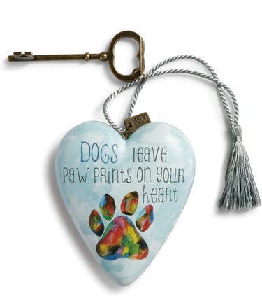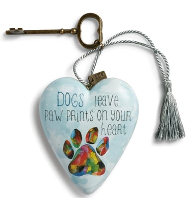 8) Heart-shaped Keepsake with key by Demdaco: I personally received one of these after losing one of my special pets and I loved it. The heart is 4X3" made of combination of resin and paper with a sweet sentiment, "Dogs leave paw prints on your heart." The heart can hang or stand with the key easel. This is a truly special keepsake for a pet owner who has lost their pet.